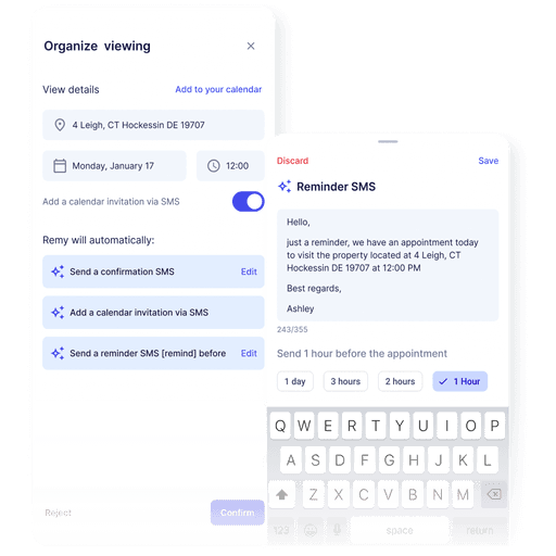 RemyAI automatically sends calendar invites and text message reminders to your clients