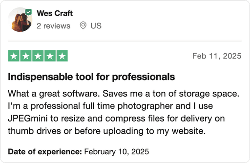 Keep perfect quality while dramatically reducing file size. More photos fit on every device, cloud storage, and online gallery.