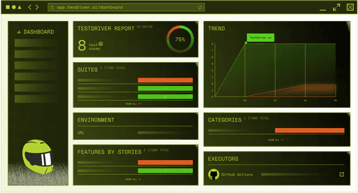 TestDriver aggregates results across runs to reveal trends in pass rates, failures, duration, and stability.