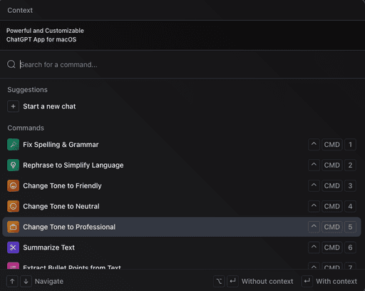 Create your own AI commands to run your favourite prompts anywhere on your Mac. Transform text, rewrite it, translate it, fix it, twist it, shake it, yeet it.