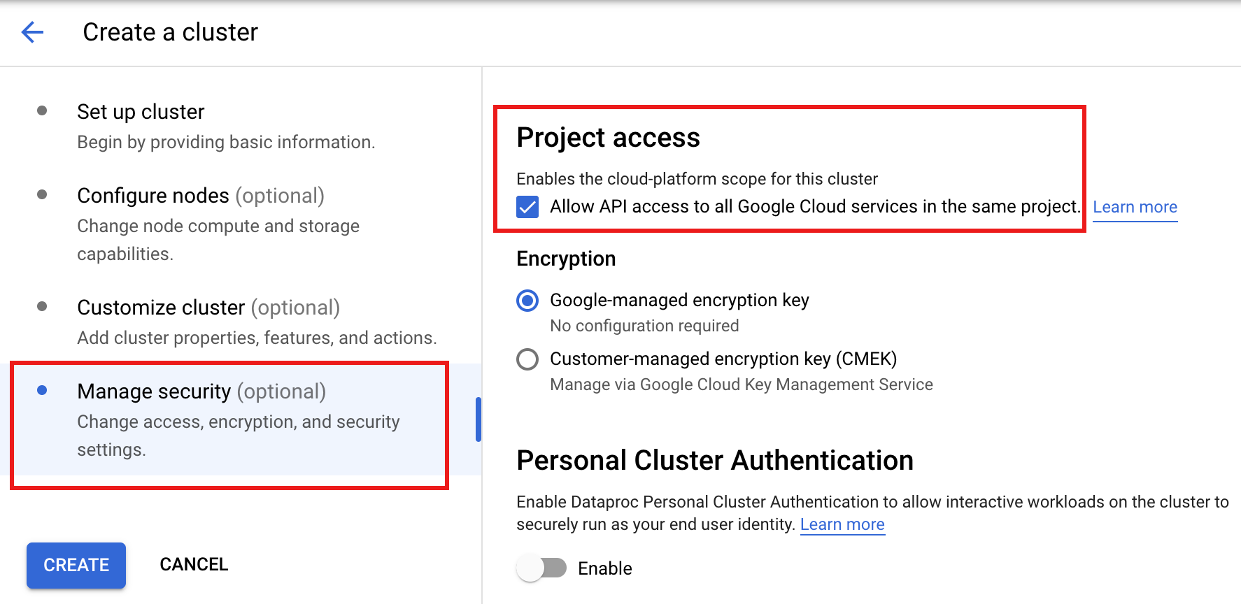 : Specify the access scope(s) for cluster VM instances (for example,https://www.googleapis.com/auth/cloud-platform