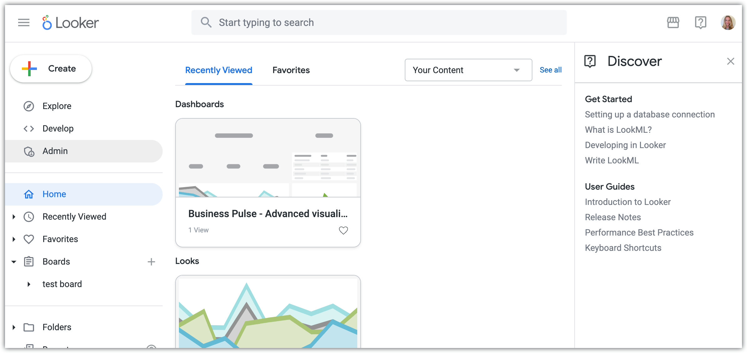 Startseite: Hier wird Ihre Startseite angezeigt, sofern Ihr Looker-Administrator die vordefinierte Startseite oder eine andere Startseitenoption aktiviert hat. Wenn Ihr Administrator ein Board als Ihre Startseite eingerichtet hat, wird der Name des Boards anstelle des Textes Start angezeigt.