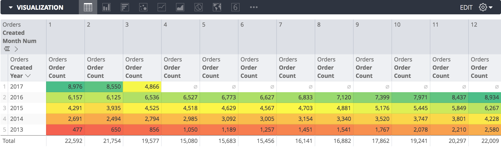 Se il grafico contiene tabelle pivot, puoi aggiungere i totali di riga selezionando la casella di controllo Totali di riga nella barra Dati. Per ulteriori informazioni, consulta la pagina della documentazione Esplorazione dei dati in Looker.