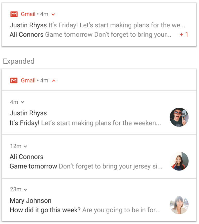 您也可以建立含有圖片、採用收件匣樣式、包含即時通訊對話,或是設有媒體播放控制項的可展開通知。詳情請參閱「建立可展開通知」。