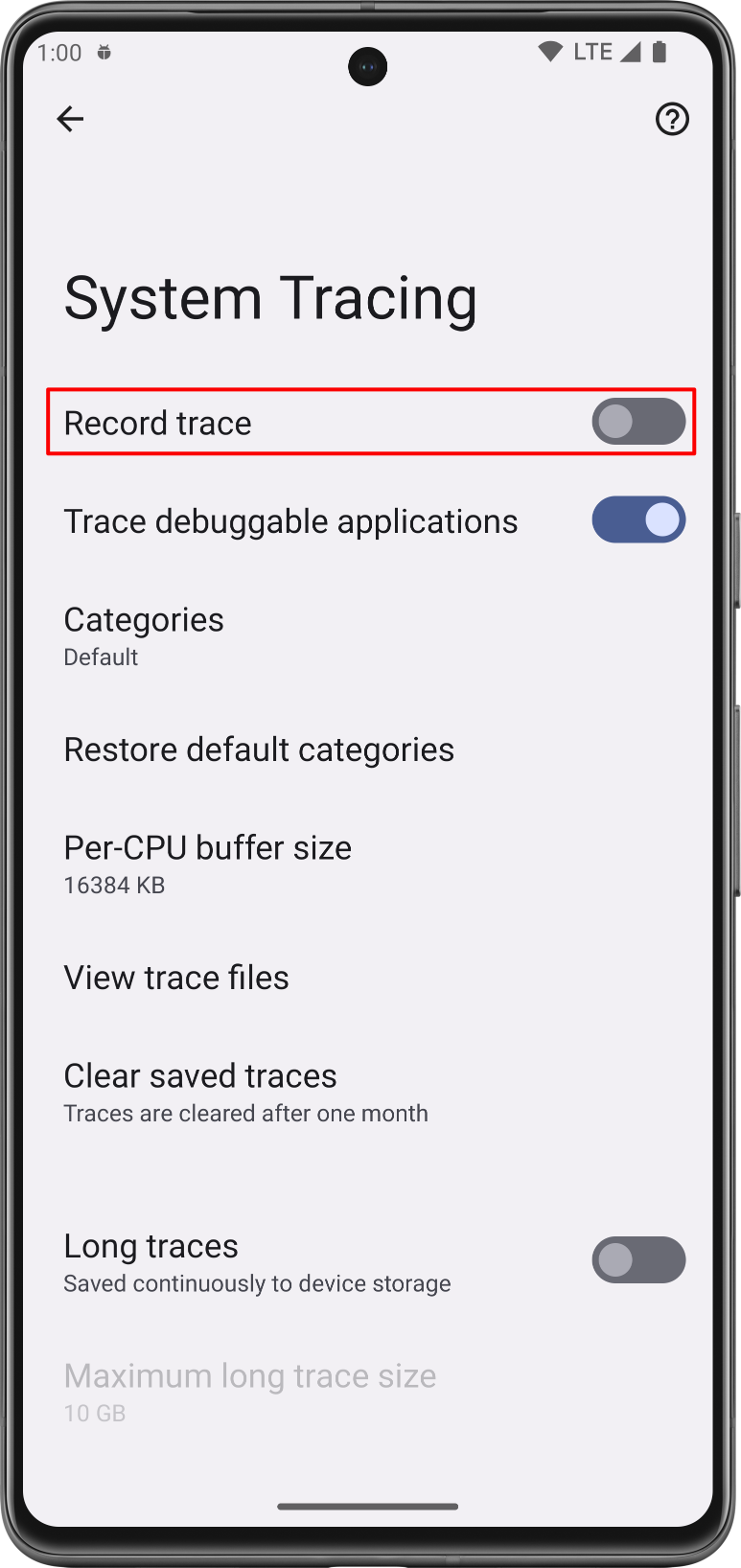 เลือกหมวดหมู่ของการเรียกใช้ระบบและเซ็นเซอร์ที่จะติดตาม (ไม่บังคับ) และเลือกขนาดบัฟเฟอร์ต่อ CPU ในหน่วย KB เลือกหมวดหมู่ที่สอดคล้อง กับกรณีการใช้งานที่คุณกำลังทดสอบ เช่น หมวดหมู่เสียงสำหรับการ ทดสอบการทำงานของบลูทูธ หรือหมวดหมู่หน่วยความจำสำหรับการจัดสรรฮีป