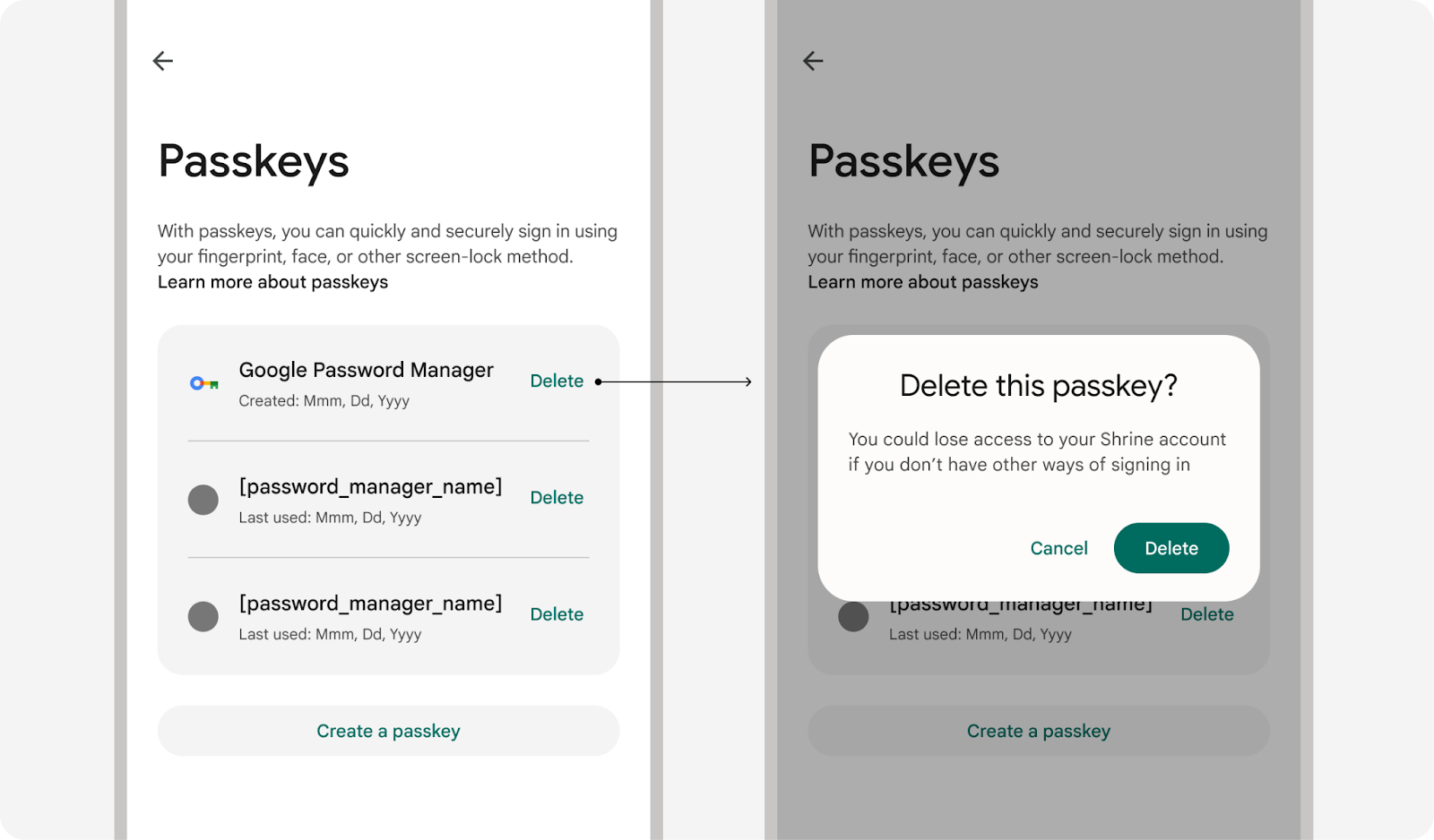 قد يحتاج المستخدم إلى حذف مفتاح المرور على منتجك، ثم إلى حذف مفتاح المرور أيضًا من مدير كلمات المرور لحذفها بالكامل، ولكن بمجرد حذفها في أي من الموضعين، فلن تعمل بعد الآن.