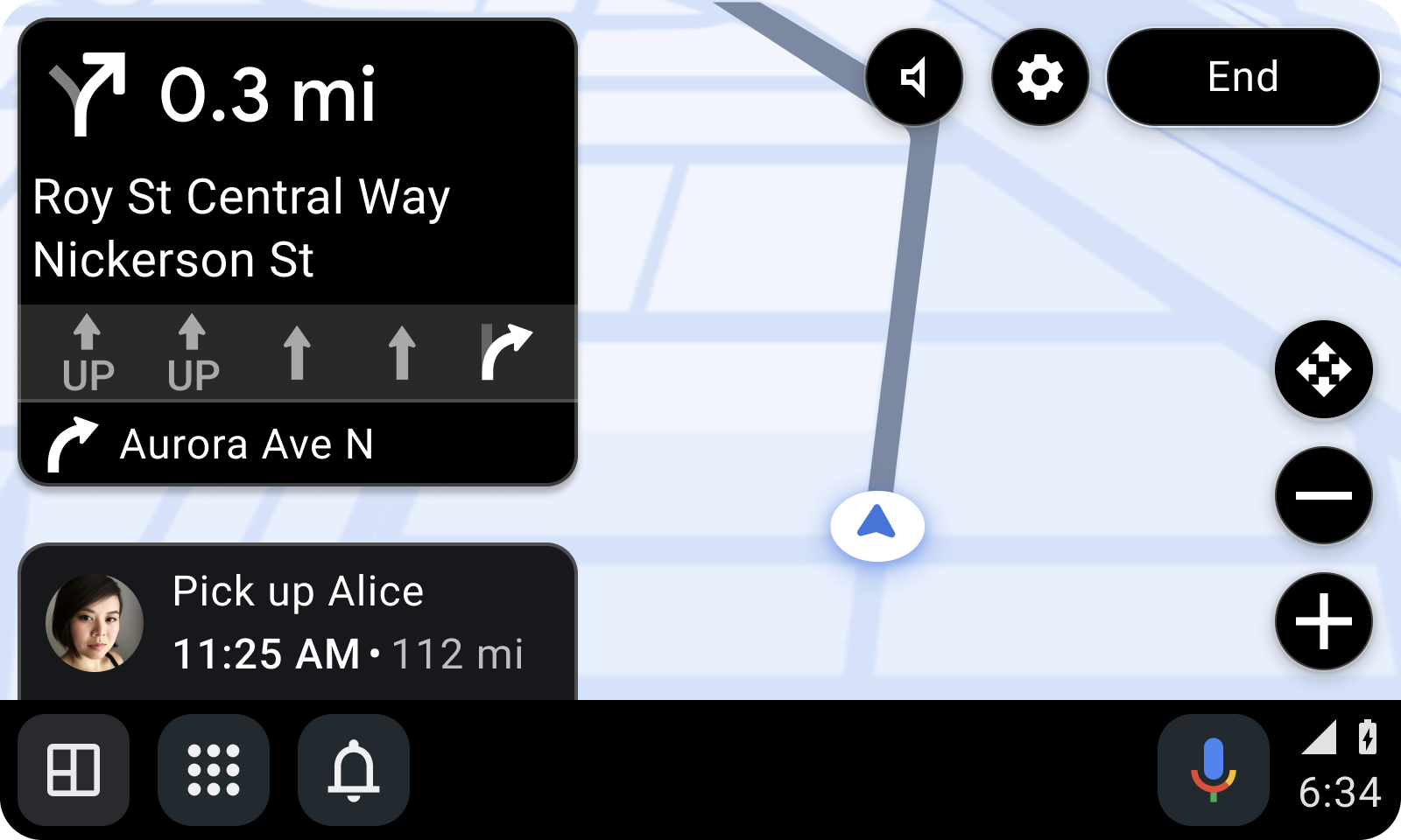 Una notifica di navigazione viene visualizzata nel widget della barra nella parte inferiore dello schermo dell'auto. Se il livello di importanza della notifica è impostato su IMPORTANCE_HIGH, viene visualizzata anche come notifica in primo piano (HUN). Se l'importanza non è impostata con il metodo CarAppExtender.Builder.setImportance viene utilizzata l'importanza del canale di notifica.
