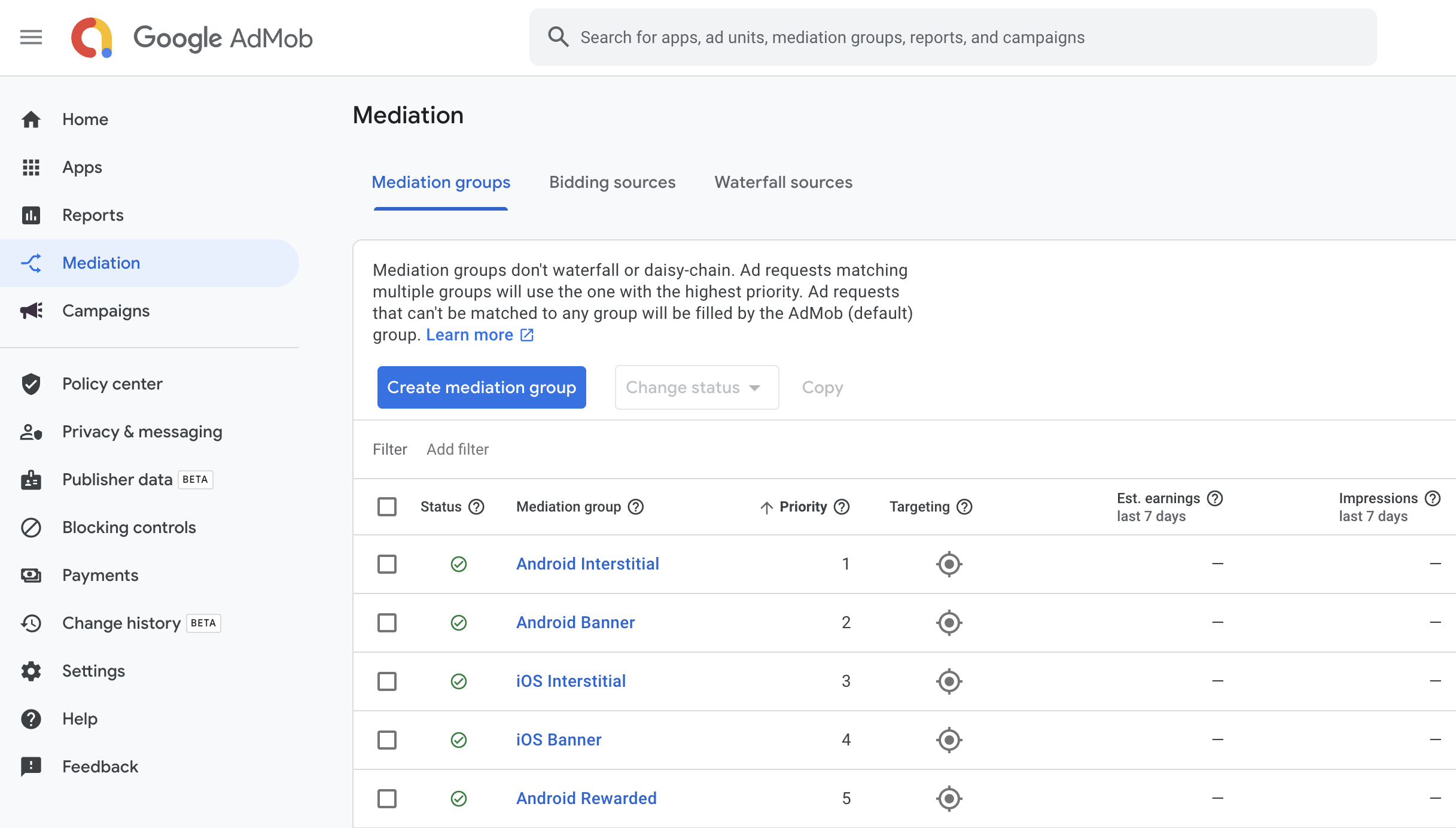 まず、AdMob アカウントにログインします。次に、[メディエーション] タブに移動します。変更したい既存のメディエーション グループがある場合は、そのメディエーション グループの名前をクリックして編集し、広告ソースとして myTarget を追加するに進みます。