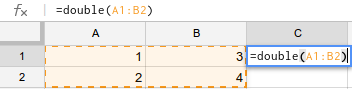 )، ستكون الوسيطة عبارة عن مصفوفة ثنائية الأبعاد لقيم الخلايا. على سبيل المثال، في لقطة الشاشة أدناه، تفسّر "برمجة تطبيقات Google" الوسيطات في=DOUBLE(A1:B2)