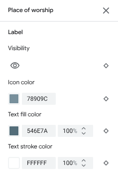 برای انواع ویژگی های نقشه که به طور کامل یا جزئی با یک برچسب نشان داده می شوند، مانند نقطه مورد علاقه یا حمل و نقل، معمولاً می توانید عناصر زیر را استایل دهید: نمایان بودن، رنگ نماد، رنگ پر کردن متن، و رنگ خط خطی متن.