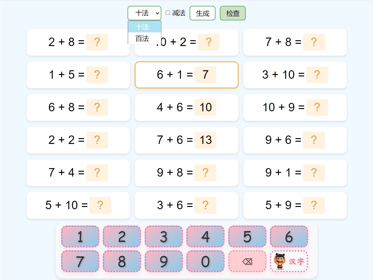 - 支持学习加减法, 设置10以内还是100以内, 设置是否支持减法