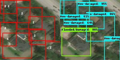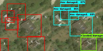 Predicted damaged/flooded buildings (red) and non-damaged buildings (green) Comparison between ground truth (left panel, '1' denotes damaged/flooded buildings, '2' denotes non-damaged buildings) and predictions (right panel, green denotes damaged buildings and teal denotes non-damaged buildings). The model is able to pick different damaged types including flooded building, blue tarp on the roof, and crashed buildings.Faster R-CNN with inception v2 backbone network was applied to the "Augmented damaged + non-damaged" training dataset. Average Precision is 0.31 for damaged/flooded buildings, 0.61 for non-damaged buildings, and 0.46 on average for the two classes. SSD outperformed Faster-RCNN in this case maybe due to the availability of pre-trained model using xView data.