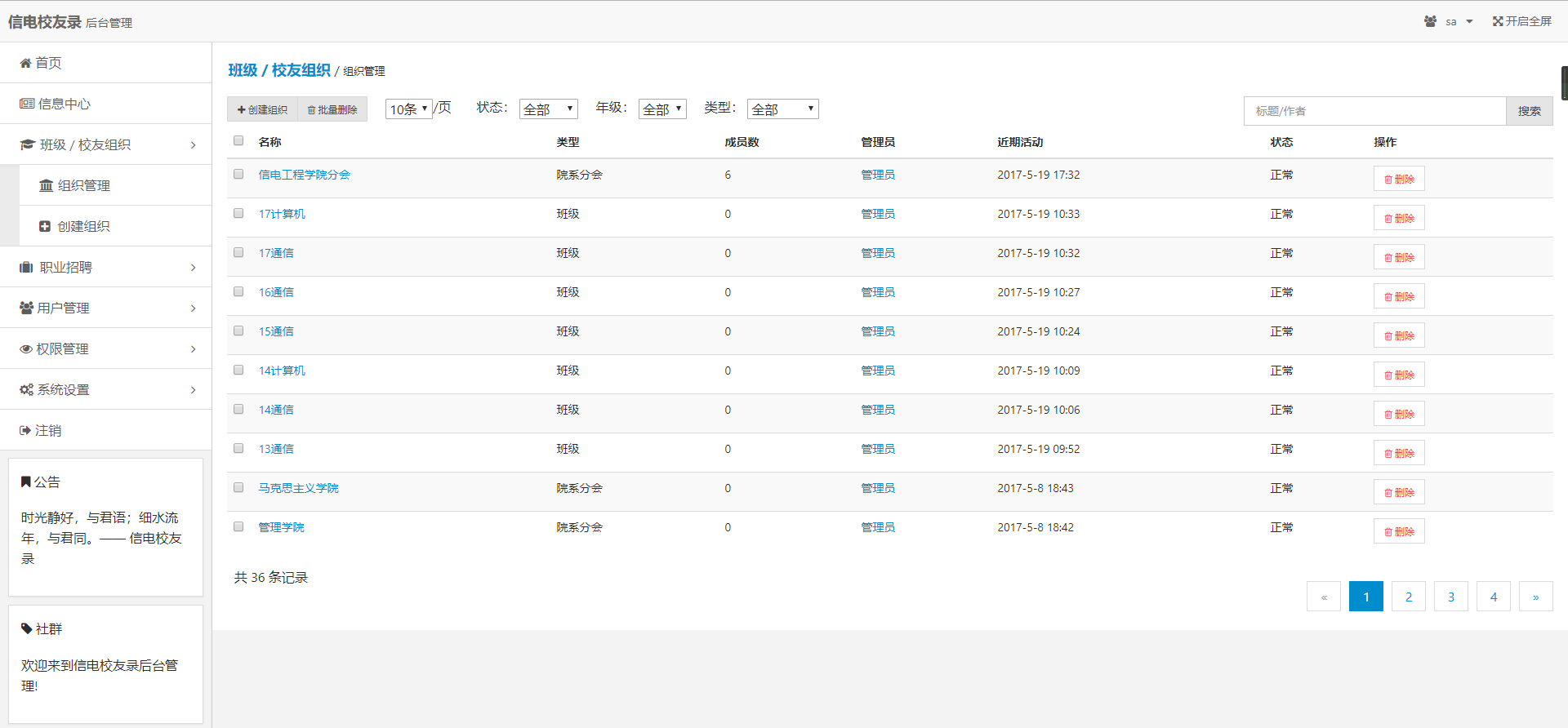 此项目作为我的毕业设计,期间我经历嵌入式开发、考研等事情,历时两年多还有部分功能未完成,有兴趣的码友欢迎共同开发,也期待此项目可以成为某某学校的校友网站^-^。