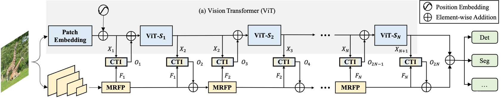 - We propose a novel dense prediction backbone by combining the plain ViT with CNN features. It effectively