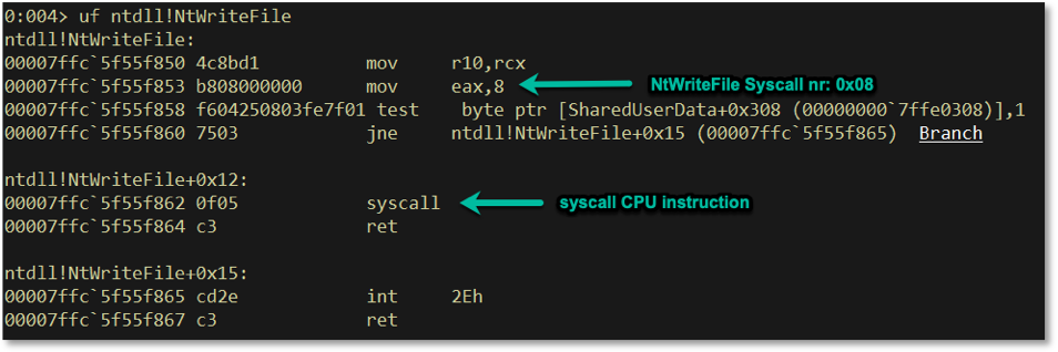 The CPU instruction for entering kernel-mode is the syscall instruction (at least on x64 architecture, which we will discuss in this blog only). We can see this in the following WinDBG screenshot, which shows the unassembled NtWriteFile instruction: