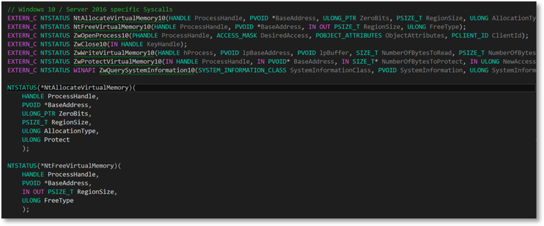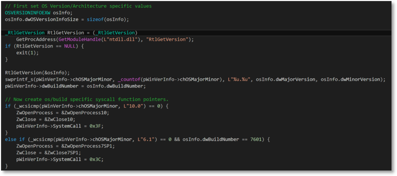 All we need to do is gather OS version information from the system we are using and create references between the native API function definitions and OS version specific system call functions in assembly language. For this we can use the Native API RtlGetVersion routine and save this information into a version info structure.