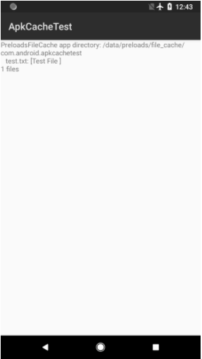 4. Протестируйте приложение. После установки приложения и создания каталога test file_cache откройте приложение ApkCacheTest. Оно должно показать один файл test.txt и его содержимое. Посмотрите на этот снимок экрана, чтобы увидеть, как эти результаты отображаются в пользовательском интерфейсе.